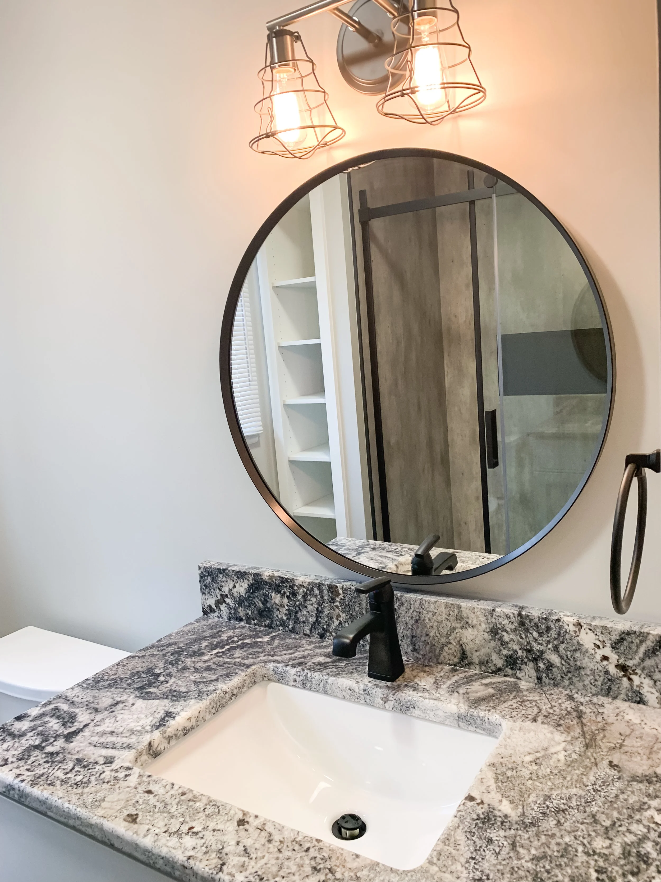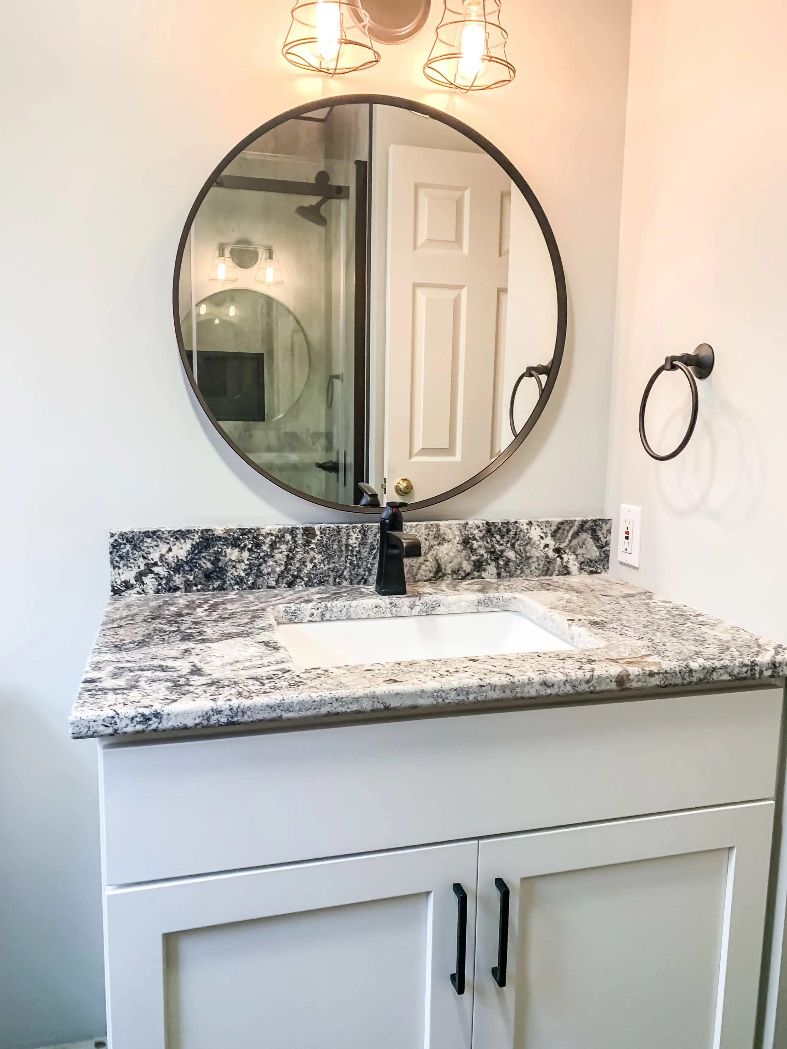 Matte black fixtures complement the metal-inspired tile flooring, while the sliding glass shower door optimizes floor space and keeps the layout open. A custom-built vanity was designed to perfectly fit the footprint and provide a taller, more comfortable height than the original. The industrial-style light fixture enhances the overall aesthetic, while a simple round mirror softens the space and balances the modern edge.