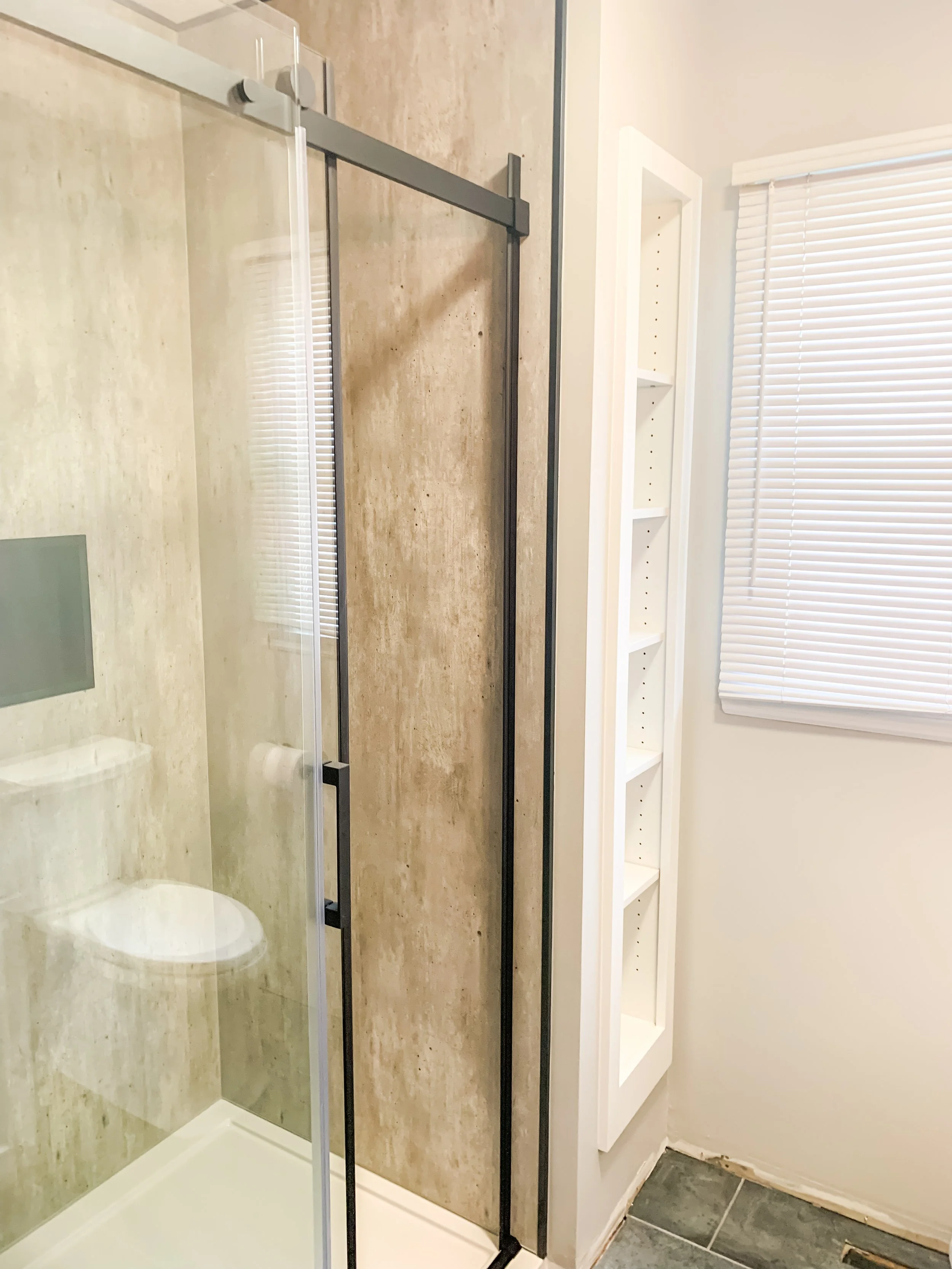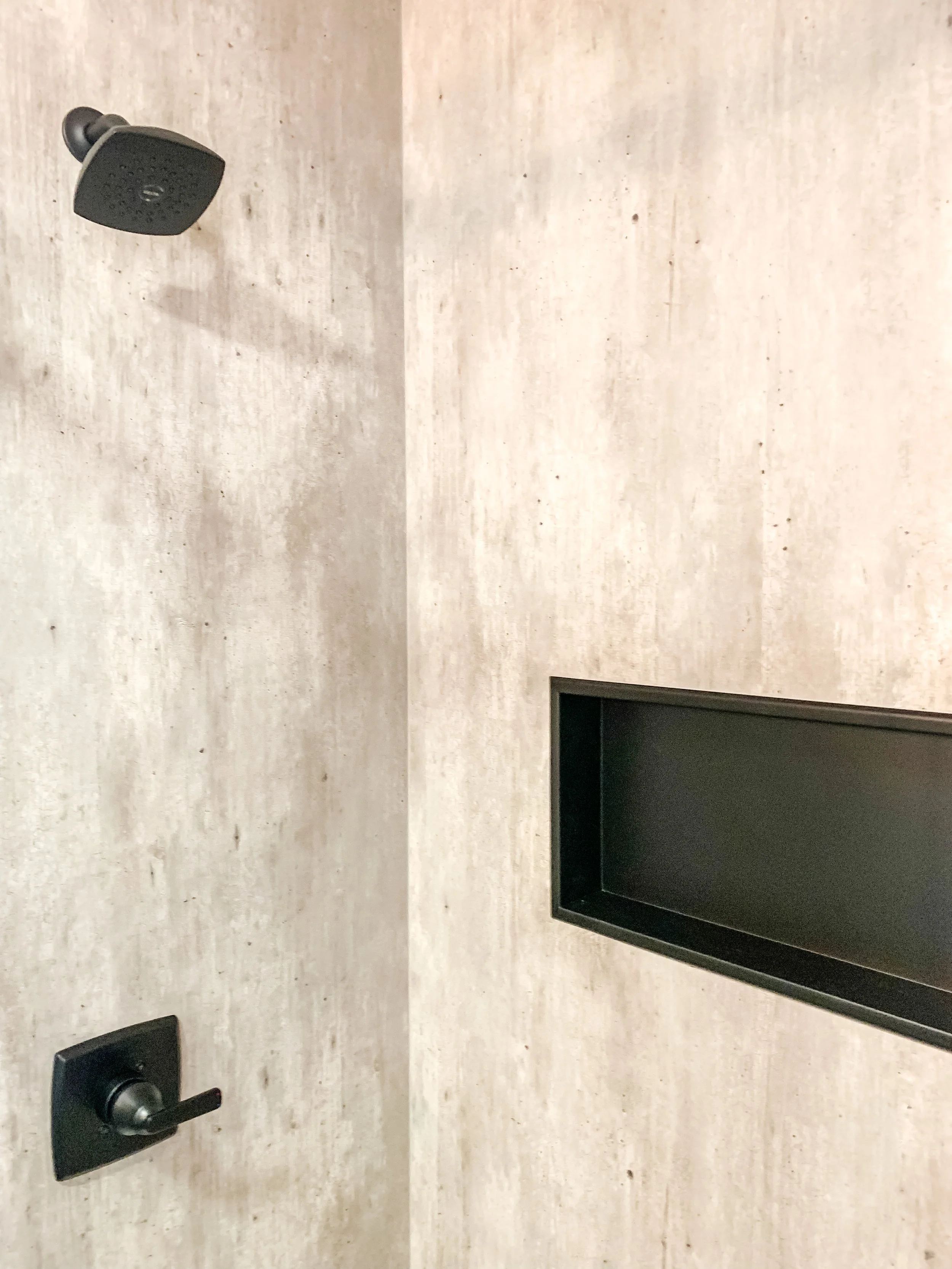 We completely gutted the space to start fresh, integrating new recessed wall shelving that doubles as hidden storage for a sleek and functional design. The shower walls, crafted from Fleurco’s marine-grade plywood panels with a tongue-and-groove installation system, mimic the look of aged concrete while offering lasting durability.
